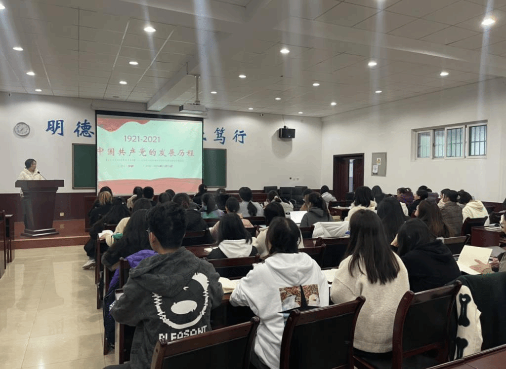 课堂上,张郁副书记首先明确了本节党课的主题并且对本节课内容进行了总体概括——以中国共产党的发展历程为主线。她从中国共产党的发展脉络和学习意义、新民主主义革命时期、社会主义革命和建设时期、改革开放和社会主义现代化建设时期和走进新时代,迈向新征程五个部分论述了中国共产党百年奋斗成就和经验。