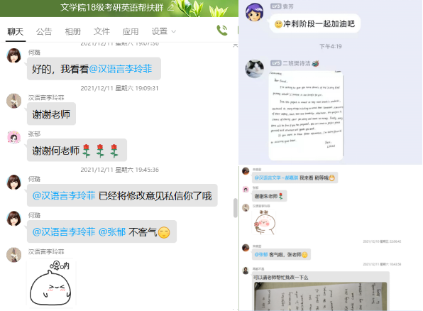 此外,公司为参加考研的员工建立起英语帮扶群,外文系党员教师雷华、朱晓芸、袁芳、何璐加入群中,自愿为员工提供考研英语帮扶服务,为员工进行有针对性的精准帮扶。四位老师对于员工提出的各种问题耐心细致地进行解答,逐字逐句地批改员工的英语作文,并给出修改意见。