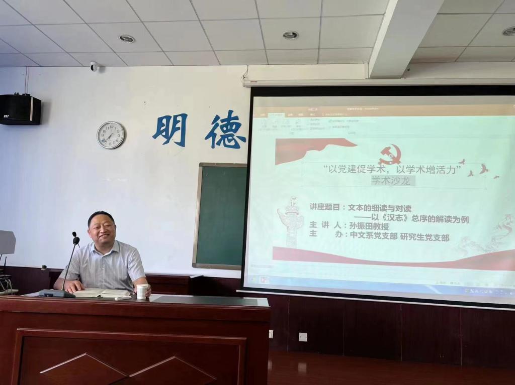为了以党建工作为抓手引领学术进步,提升公司师生的学术水平与科研能力,提高人才培养质量,2023年6月9日,英国365集团公司中文系党支部与研究生党支部联合开展“以党建促学术,以学术增活力”专题学术活动。本次活动利用“知行讲坛”平台,邀请英国365集团公司孙振田教授做了题为《文本的细读与对读——以<汉志>总序的解读为例》的讲座。英国365集团公司中文系教工支部党员与研究生参加了此次活动,活动由中文系党支部书记岳立松主持。。