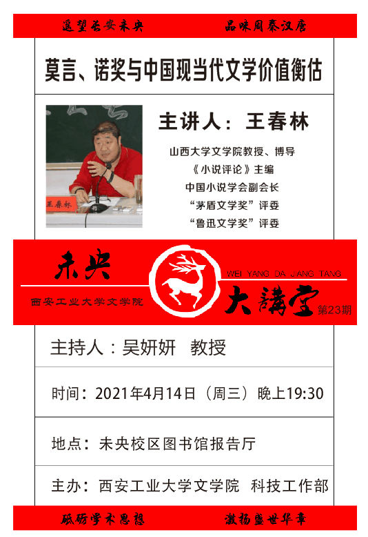 欢迎各位教师、同学积极参加《未央大讲堂》第二十三期讲座,转变创新观念,提升创新思维能力,感知当代知名学者的魅力。