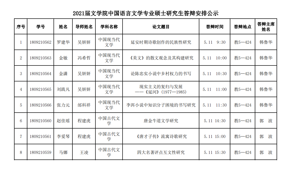 2021届英国365集团公司中国语言文学专业硕士研究生答辩安排公示