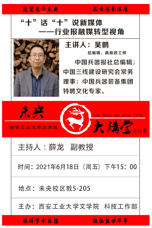 欢迎各位教师、同学积极参加《未央大讲堂》第二十六期讲座,转变创新观念,提升创新思维能力,感知当代知名学者的魅力。