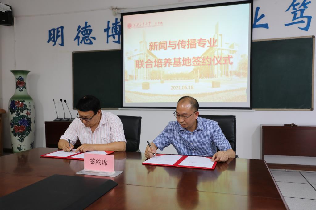 朱晋中书记与吴鹏总编辑签定《研究生联合培养基地合作协议书》,并对吴鹏总编辑的加盟表示热烈欢迎,希望大家共同努力,加强合作,不断促进新闻与传播专业的发展。