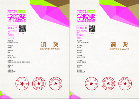公司网络与新媒体、广告学等本科生、新闻与传播学硕士生参与了本次赛事。其中,网新20级苏曌妍、王欢欢、杨姣姣、杨蓉菲、杨润晴同学的作品《起“丝”回生》,姚鑫悦、杨青青同学的作品《我有一个梦想》分获全国铜奖。这同时也是公司近年来首次在公司奖中获得国家级等级奖。