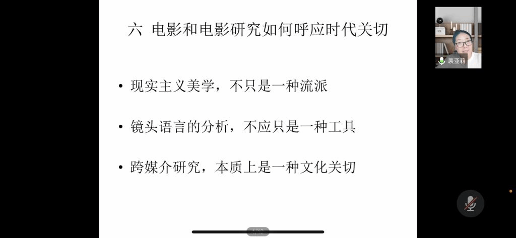 裴亚莉教授被称为西部电影掌舵人的第四代导演吴天明讲起,通过选取第五代、第六代导演中的西部电影导演代表如张艺谋、贾樟柯王全安等为个案,呈现1980年代以来西部电影发展脉络,揭示西部电影现实主义审美特色的确立、传承发展。最后,裴教授结合个人的学术道路与学术经验,以电影研究为例,指出学术研究应呼应时代关切。