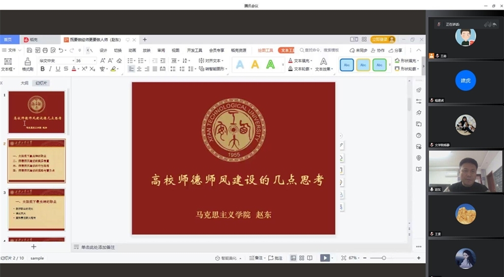 报告中,赵东副教授分别从“太阳底下最光辉的职业”“师德师风建设的现实考量”“师德师风建设的行为规范”和“师德师风建设的理路与着力点”等几个方面,谈了高校师德师风建设的思考与想法,认为身为教师要坚持课比天大,坚守师德师风行为规范,谨遵习近平总书记指出的“教师要当好员工成长的引路人”,做到立德修身、潜心治学、开拓创新。赵老师在讲座中提出“人品决定产品”“课比天大”“高尚而富有魅力的教学是活的教科书”“以人树人”“廉洁从教”“四个关系”“五个自觉”“六个意识”等观点,富有启发意义。最后,赵老师以“饮其流者怀其源,学其成时念其师;山高水长有尽时,唯有师恩日月长”为结束语,为这场精彩的报告完美点睛。