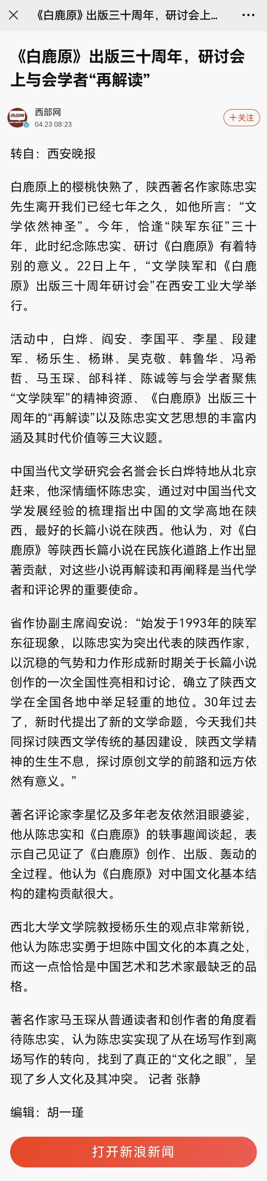 新浪新闻转载西安晚报《<白鹿原>出版三十周年,研讨会上与会学者“再解读”——中国的文学高地在陕西》