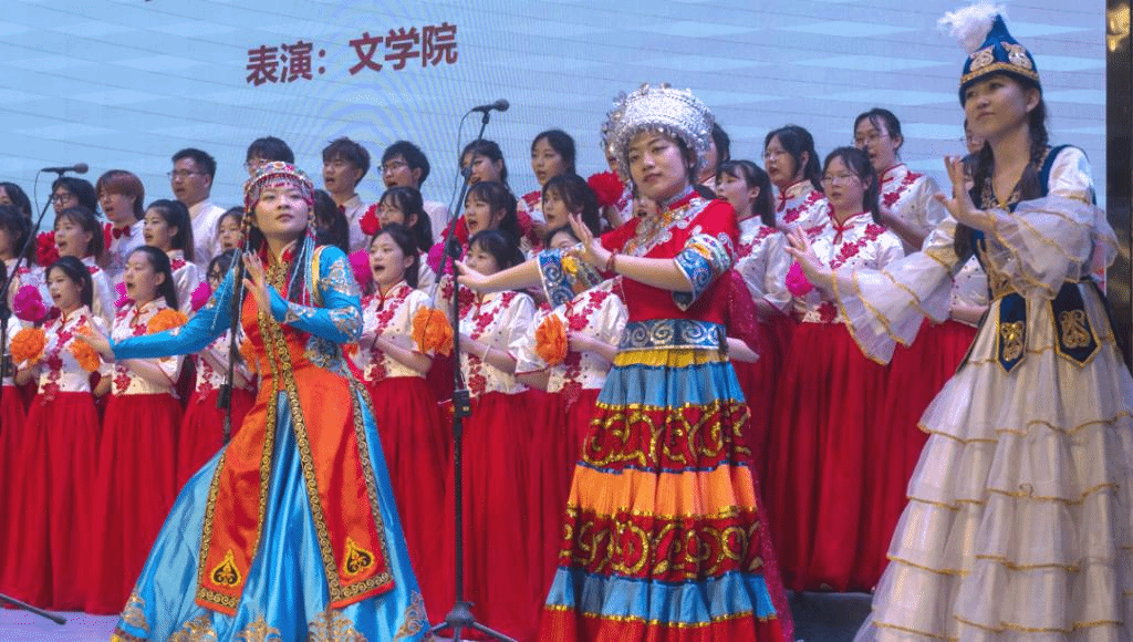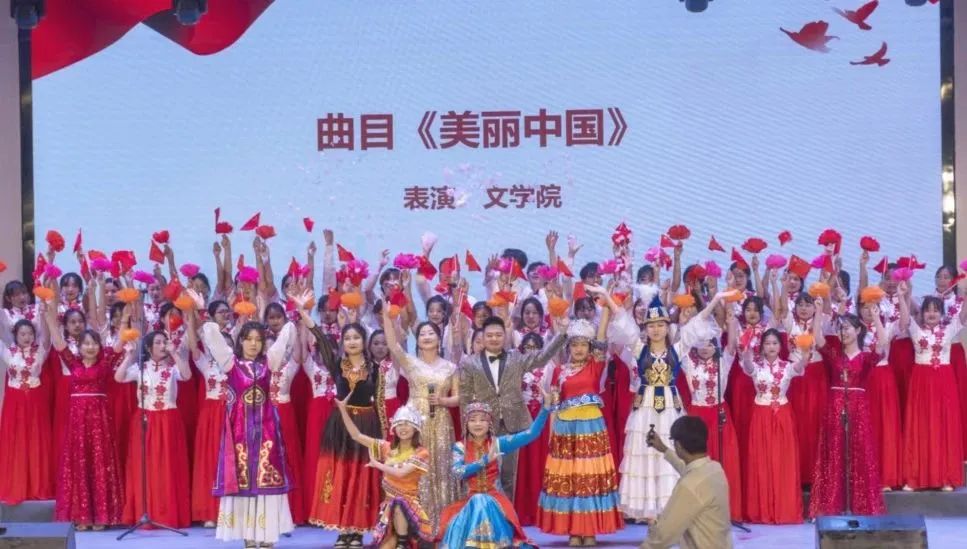 在悠扬舒缓的小提琴伴奏下,中文系宋颖桃、孙振田老师深情朗诵,致敬祖国母亲,礼赞巍巍华夏。接着,激昂欢快的前奏响起,英语专业刘明同学指挥若定,把控全场,在他矫若游龙的手势引导下,中文系李若琛老师嘹亮开唱,声如裂帛,响遏行云,同学们用激越慷慨的合唱回应,情往似赠,兴来如答,一曲《美丽中国》大气磅礴,震撼全场。在合唱表现形式方面,有齐唱、对唱、轮唱,在表演形式方面,有队形移动变换、花卉彩纸等道具使用,在舞台设计方面,由白格格、廖蕊娇等6位同学身着民族盛装的伴舞,促柱繁弦,歌声舞态,美不胜收,为全校师生呈现出一场美轮美奂的歌舞盛宴。最后一个音符还未唱完,现场已经掌声雷动、欢呼声四起,评委们一致亮出最高分,观众评价“真有点春晚的感觉”。