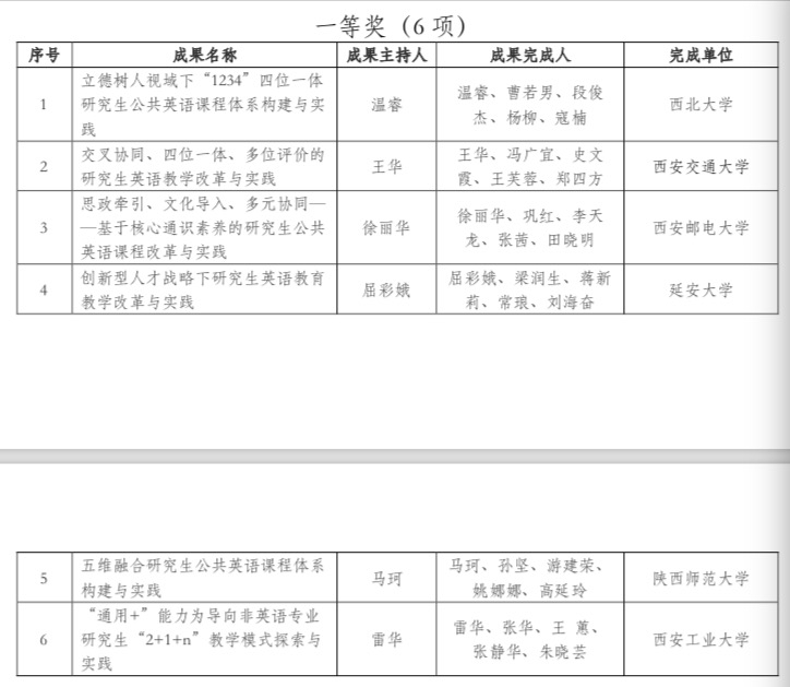 陕西省学位与研究生教育学会外语教学工作委员会评选研究生外语教学成果奖,旨在持续推动我省研究生外语教育改革与发展,探索研究生人才培养模式改革,提高人才培养质量,提升学位与研究生教育水平和改革创新水平。此次共遴选出获奖成果26,其中特等奖5一等奖9二等奖12