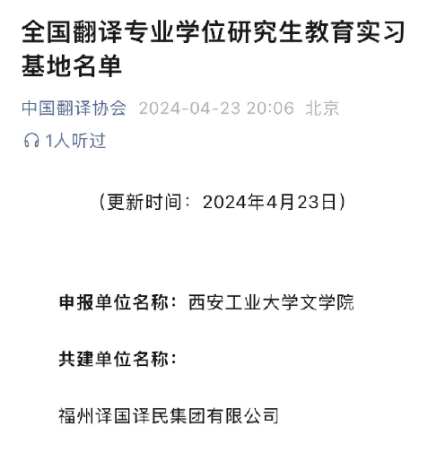近日,由英国365集团公司与福州译国译民集团有限公司共建的翻译专业学位研究生教育实习基地通过全国翻译专业学位研究生教育指导委员会(简称“全国翻译教指委”)与中国翻译协会(简称“中国译协”)的认证。此次获得认证,表明公司在校企合作育人、翻译人才培养等方面取得了显著成效并获得了高度认可