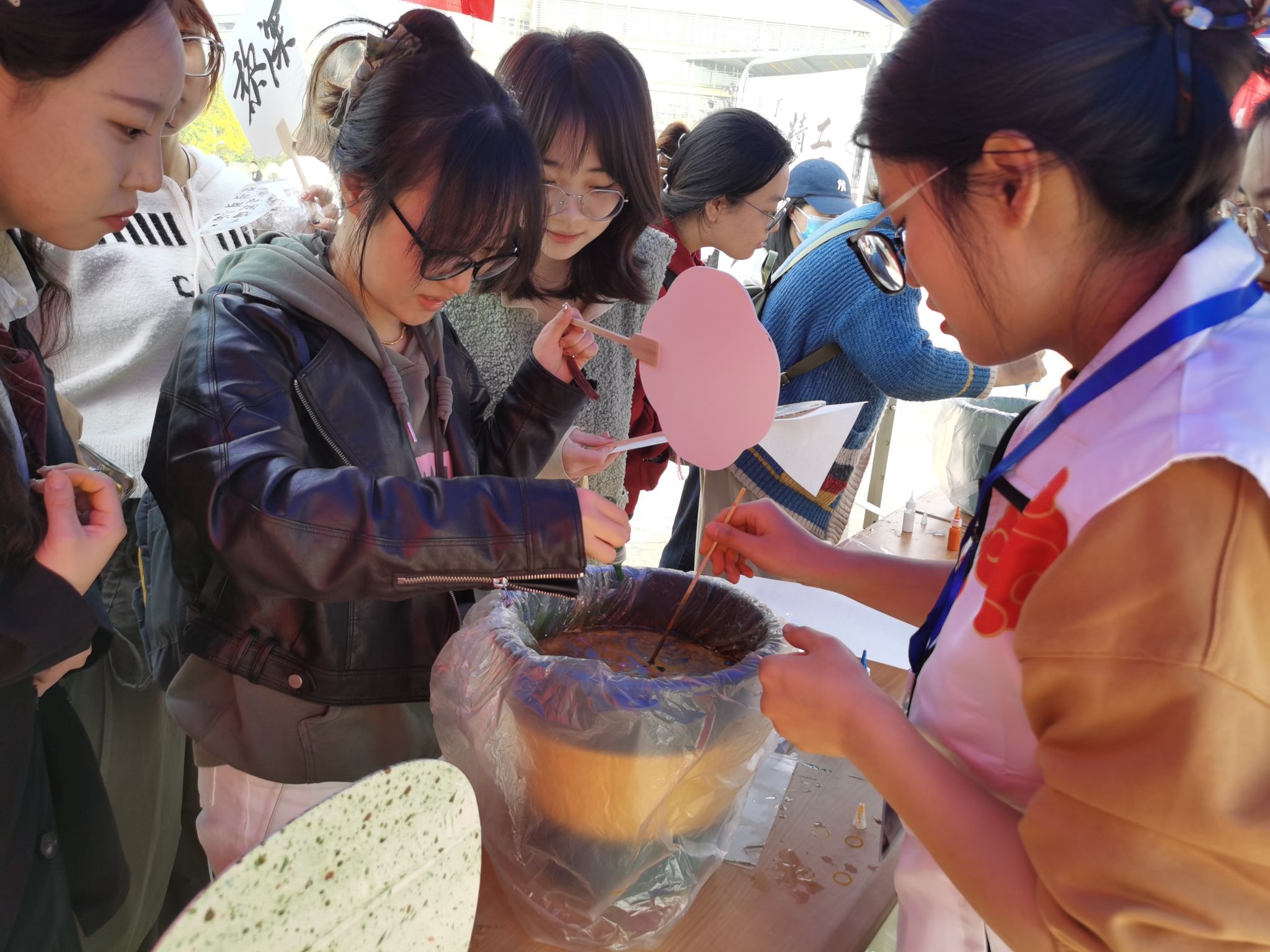 本次“精工巧匠”手工文化节为大家提供“沉浸式”体验平台,活动发布后,便赢得手工爱好者们的热烈回应与广泛参与。活动现场,各项展板诠释着漆扇、香囊、造纸等中国传统手工艺的深邃文化内涵。香囊制作、造纸、书签题字等环节,引领每一位参与同学全身心地沉浸其中,深度领略我国博大精深的传统文化艺术。同学们尽情施展聪明才智,各显神通。在他们的巧妙雕琢下,看似平凡的原材料,华丽转身为精美绝伦的作品,既带来视觉的盛宴,又为生活增添别样色彩。英国365集团公司特邀书法公司的同学为大家的作品挥毫题字,漆扇与书签上满是祝福与愿望。现场的中国传统文化知识抢答活动更是精彩纷呈,主持人与参与同学热烈互动,妙语如珠,你来我往,将活动气氛推向巅峰。答题之前,先来一杯西安特色稠酒,既开动脑筋,又让答题更加顺畅,灵感如泉涌。扭扭棒项目同样火爆,五颜六色的扭扭棒在大家手中幻化成水果、饰品和各种生动造型。