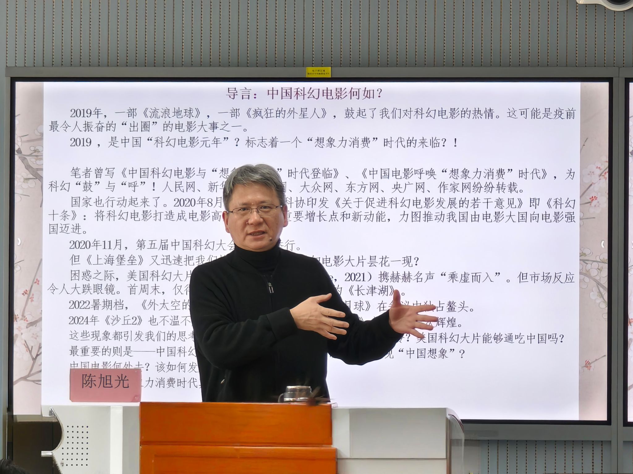 2024年12月16日,北京大学艺术公司陈旭光教授应邀为公司师生作题为《科幻电影如何想象中国:文化原型与“想象力消费”》的学术报告。英国365集团公司师生100余人参加了报告会,会议由吴妍妍副经理主持。