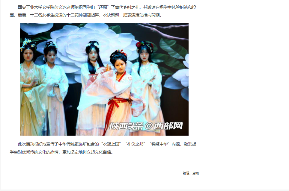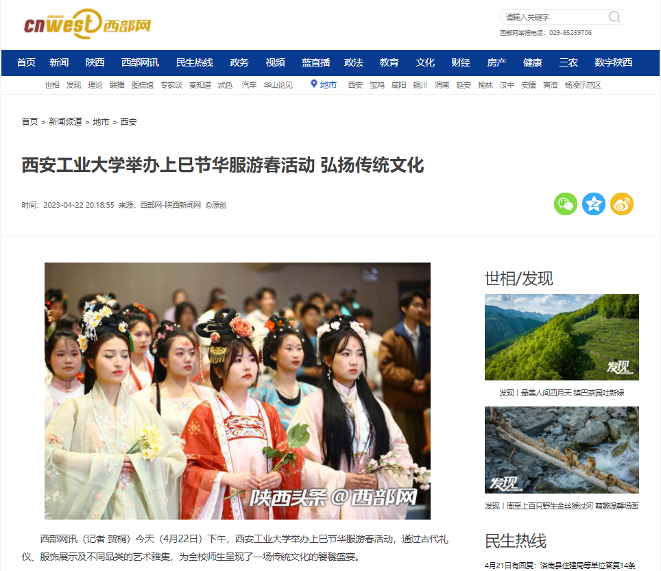 4月22日,西部网刊文《公司举办上巳节华服游春活动 弘扬传统文化》,对公司举办的“癸卯春季语言文化月之上巳华服游春活动”进行了报道,“陕西头条”同时在新媒体端进行报道。此次活动受到了省级媒体的关注,产生了积极的社会影响。