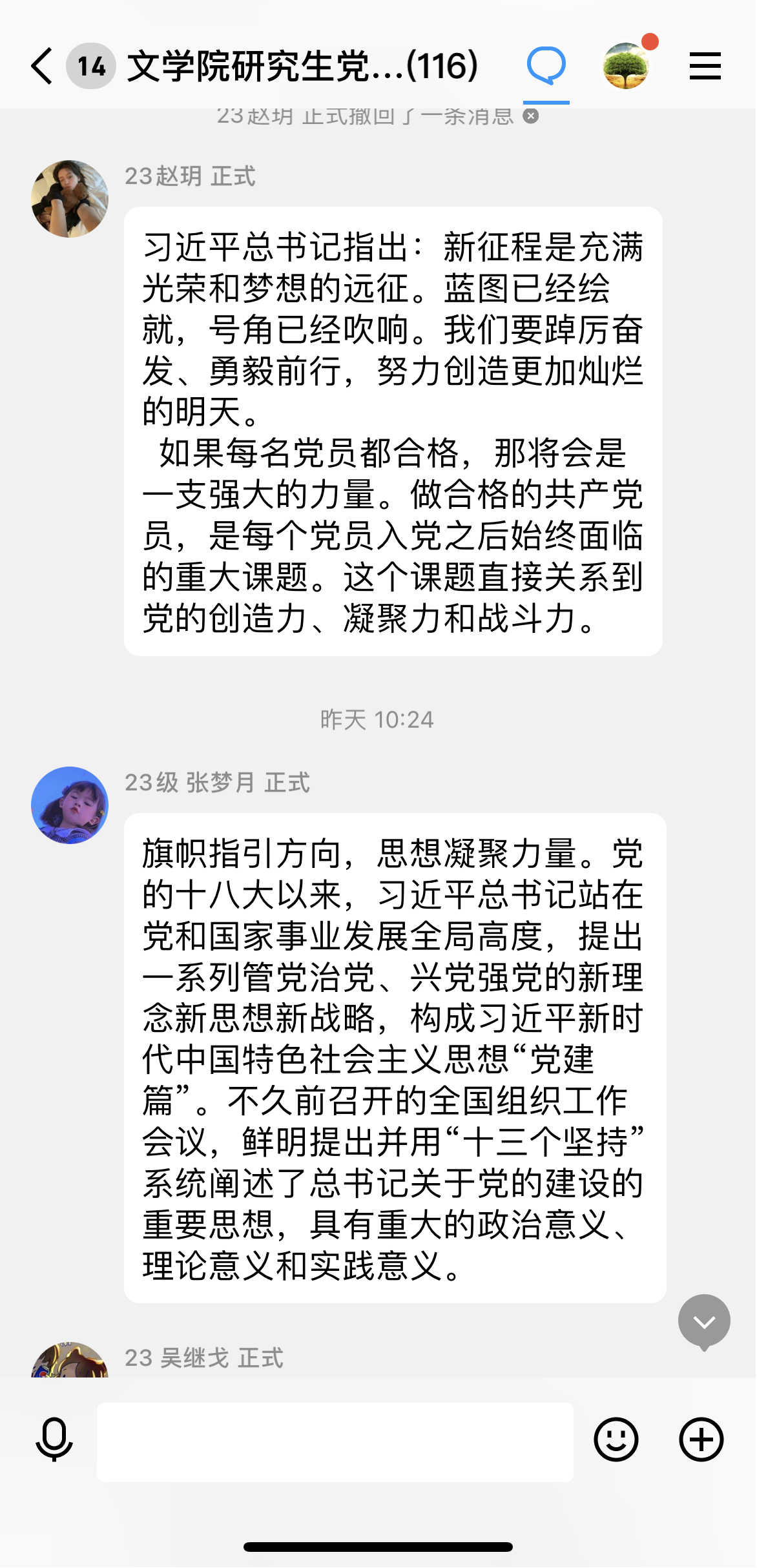 党员李婉卓谈到,全面建设社会主义现代化国家,全面推进中华民族伟大复兴,关键在党,关键在人,我们要坚持不懈用党的创新理论武装自己的头脑,指导自己的行动,提升自身素质,不断适应党和国家事业发展需要,努力做到以学铸魂,以学增智,以学正风,以学促干,提高政治站位,将自己融入到组织中去,发挥个人和组织的最大力量,提高工作质量,为实现党在新时代新征程的使命任务赓续奋斗。