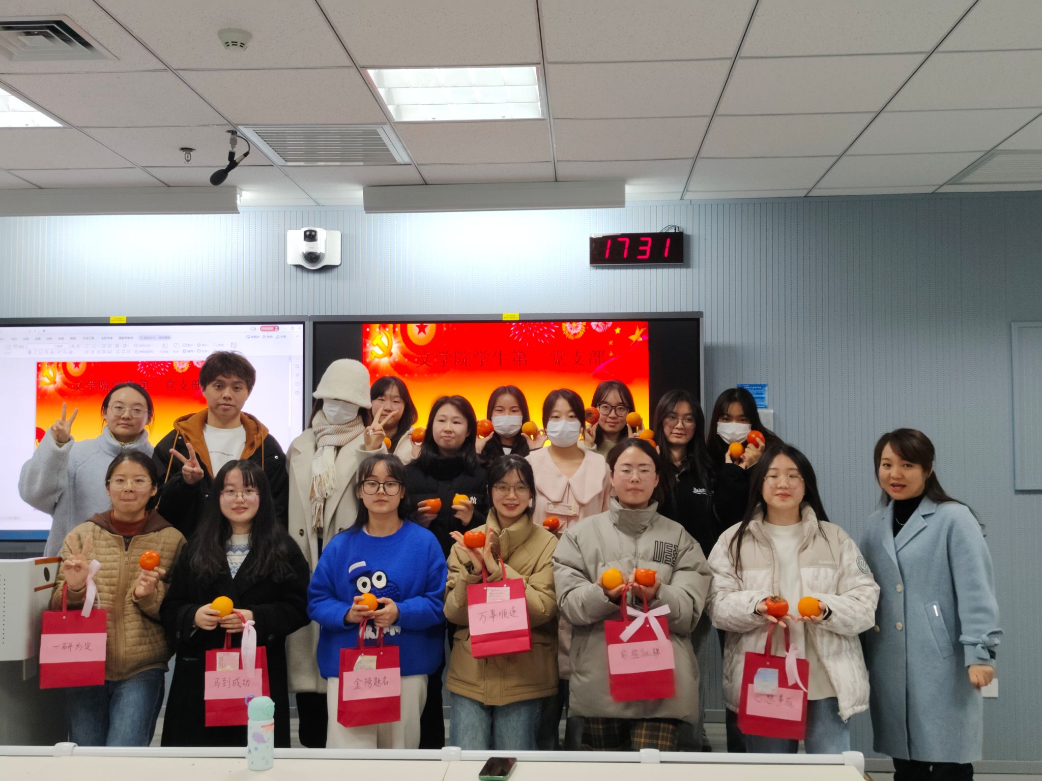 本次活动策划者21级员工党员宋倩同志表示:每个礼物袋都用寓意美好的四字成语命名。在礼物袋中,他们装了棒棒糖、橙子、柿子和花生,代表“越来越棒”、“心想事成”和“好事发生”,还装有中性笔2根、口罩2包等考研必需品,同时每个礼物袋中还有手写送给学姐的祝福贺卡。