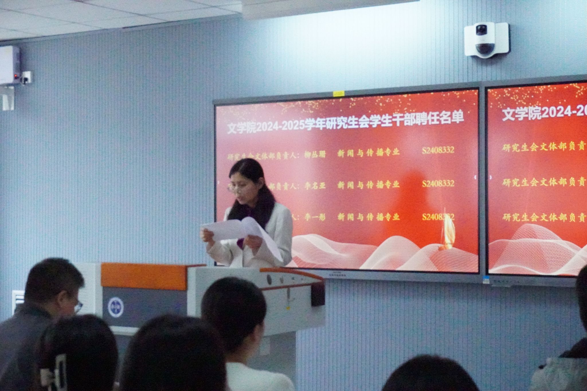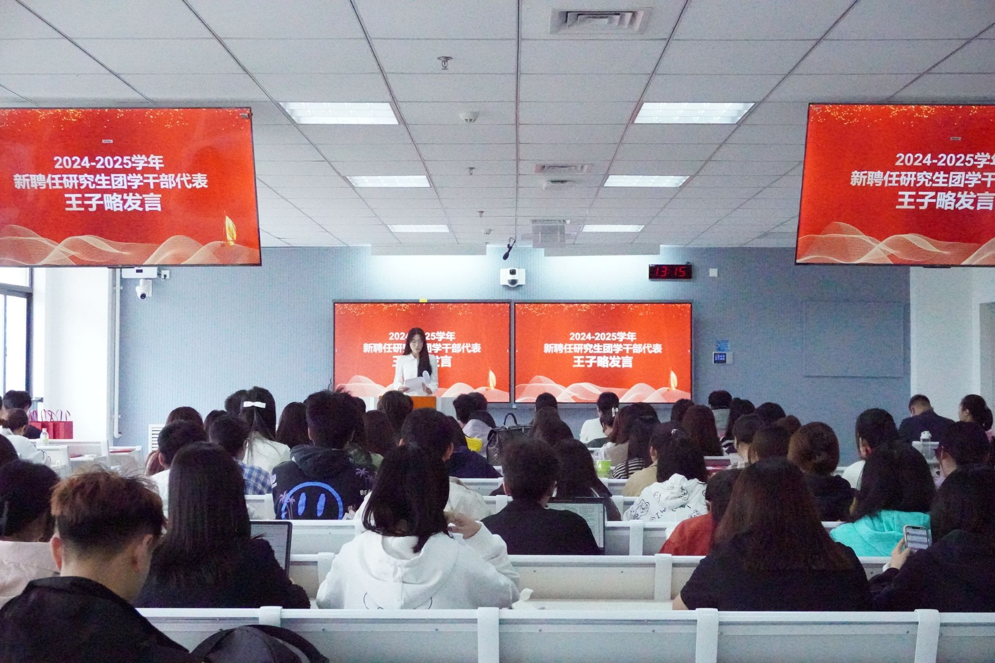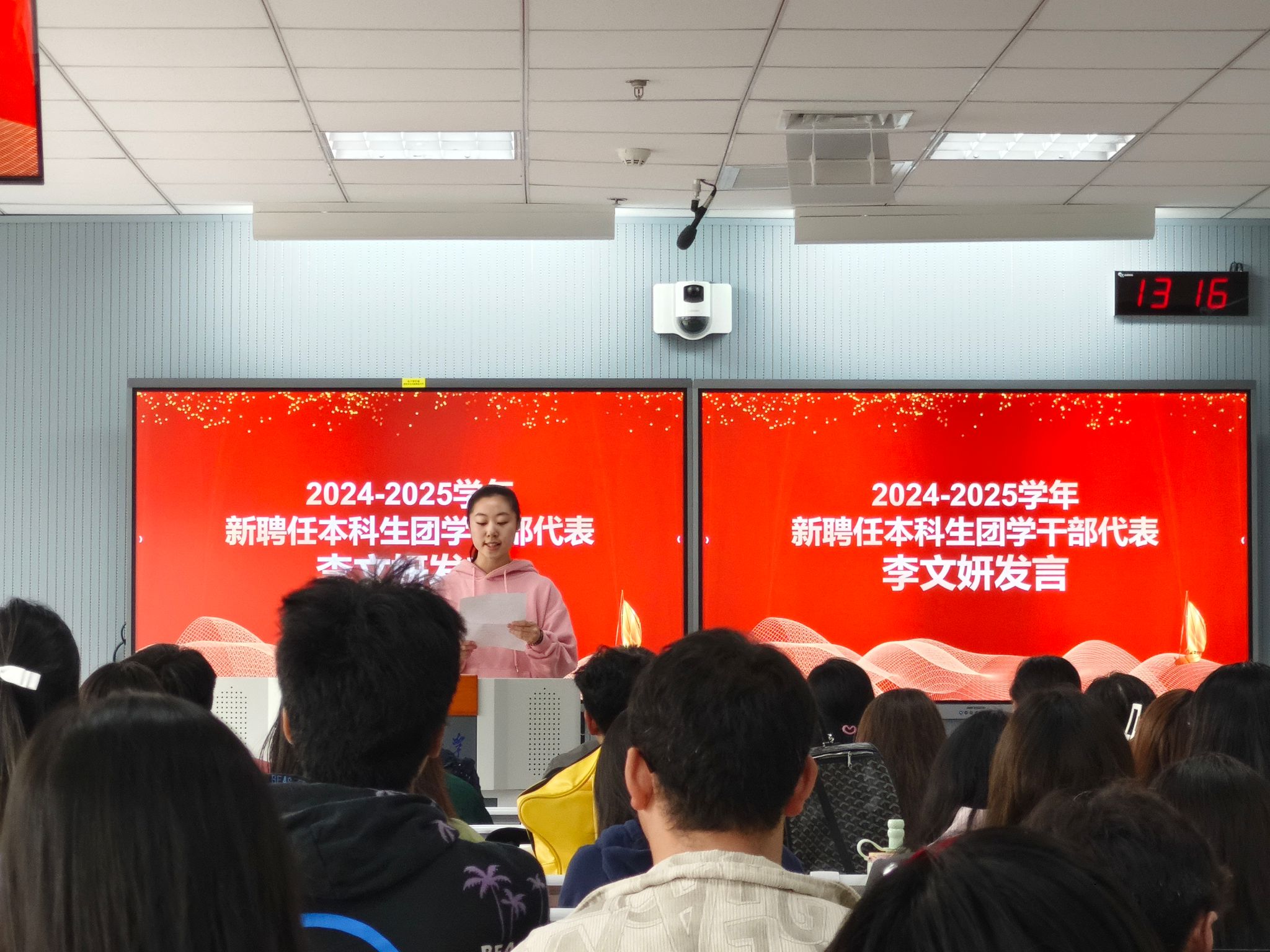 随后,2023-2024学年团学干部代表田馨发言。田馨同学回顾了过去一年英国365集团公司团学工作的突出成效,强调员工干部要继续发扬“团结、服务、创新、奉献”的精神,不断提升自身综合素质,更好地服务同学,服务公司,服务社会。2024-2025学年新聘任研究生团学干部代表王子略与本科生团学干部代表李文妍也相继上台发言,她们表示新一届的团学干部要坚定自身信念,严于律己,发挥榜样作用,坚持团结协作,继续走好传承创新之路,为英国365集团公司团学工作贡献青春力量。