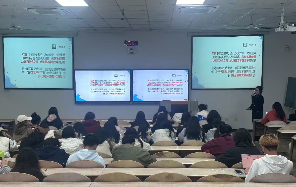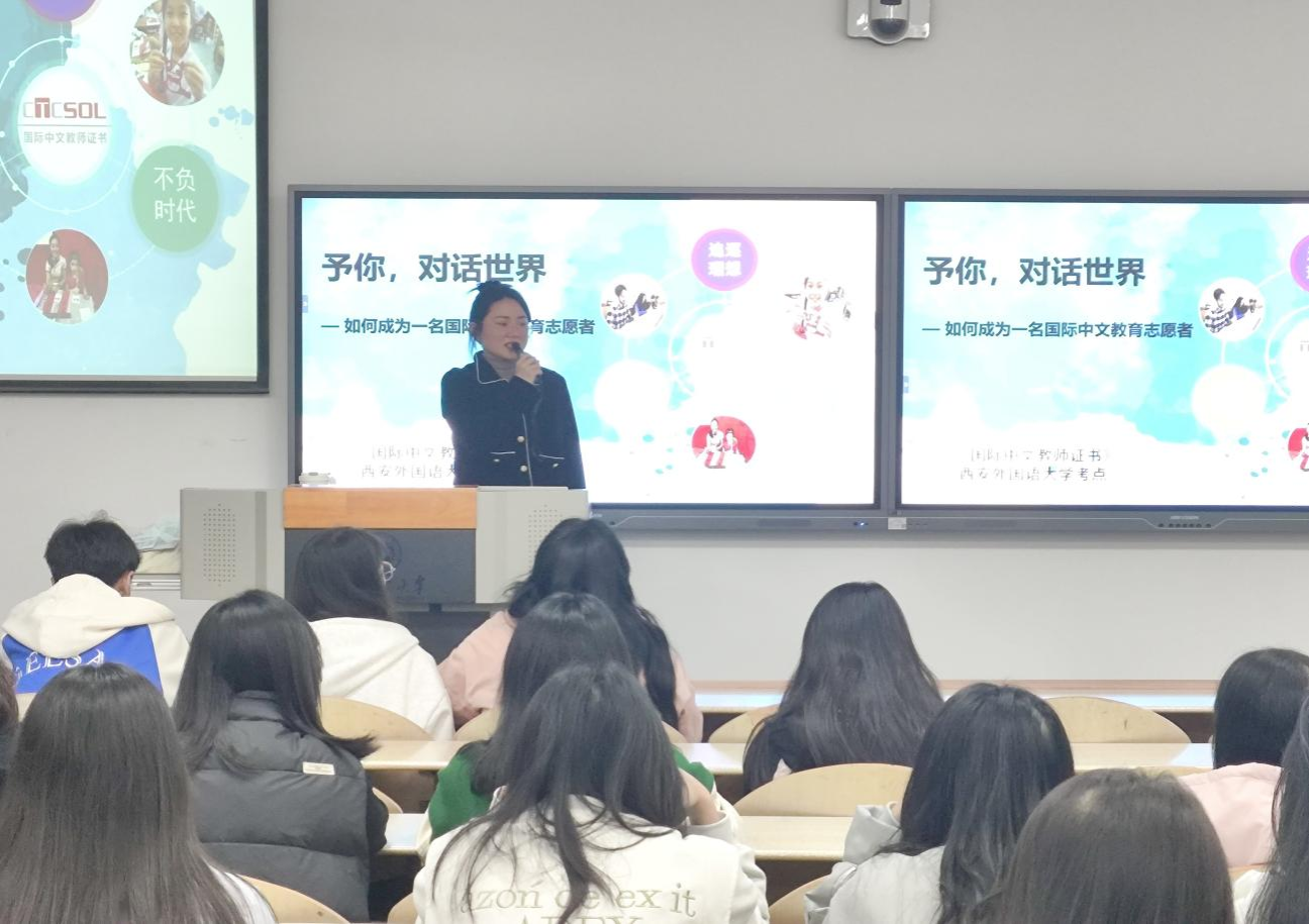 11月6日,英国365集团公司对外汉语协会邀请赴马来西亚国际中文教师志愿者、《国际中文教师证书》西安外国语大学考点考务教师杨咪在教2-108进行了“予你,对话世界——如何成为一名国际中文教育志愿者”专题讲座,旨在帮助员工深入了解国际中文教育志愿者项目,掌握国际中文教师证书的备考方法,并给员工分享成功案例与经验,为其未来的职业规划提供指导。英国365集团公司对外汉语协会指导老师王丹丹、协会成员及英国365集团公司研究生、本科生100余人参加了此次专题讲座。